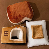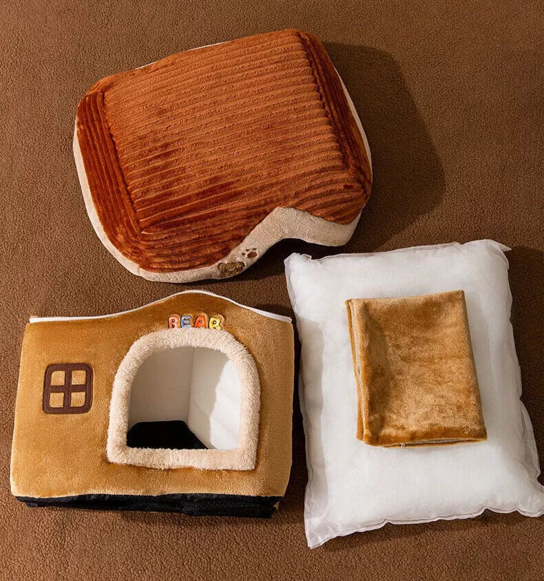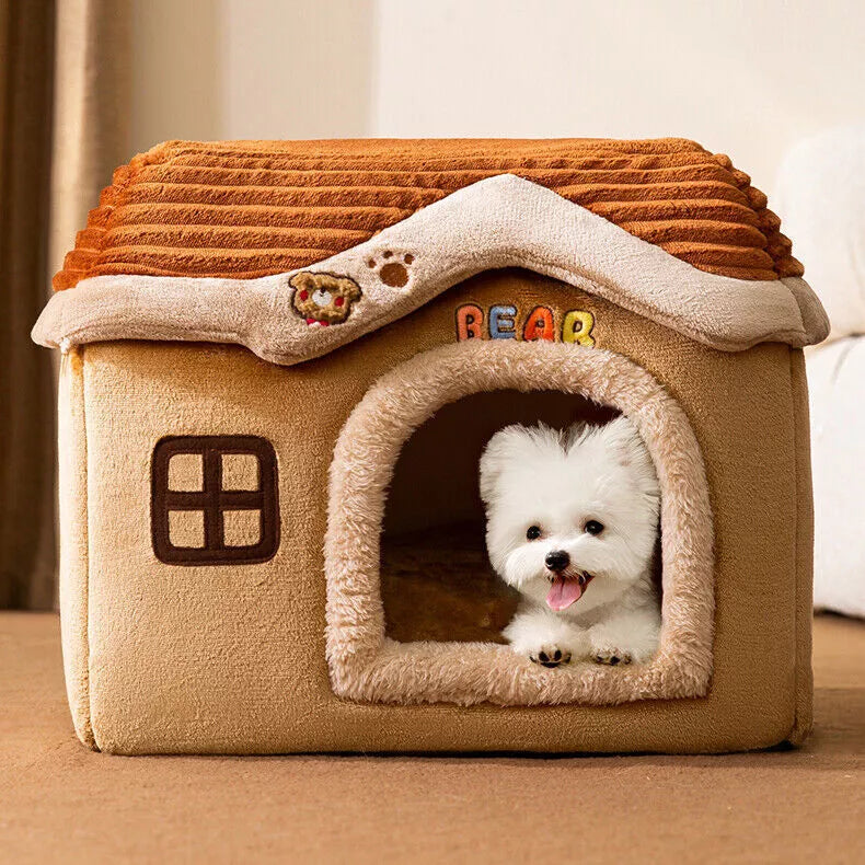 Welcome your furry companion into the ultimate comfort with Pup Palace's Charming Cottage Dog House Bed! Designed to resemble a quaint little home, this cozy retreat features soft, plush fabric in warm beige and brown tones. Adorned with playful details like the word 'Bear' and a cute paw-print emblem, it’s both stylish and functional. The spacious interior and padded base make it the perfect sanctuary for small to medium-sized pets who love to relax in comfort and security. With its adorable window accents and snug roof design, this bed is a delightful addition to any room while giving your pet their own palace to call home!