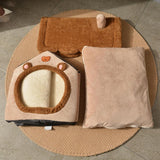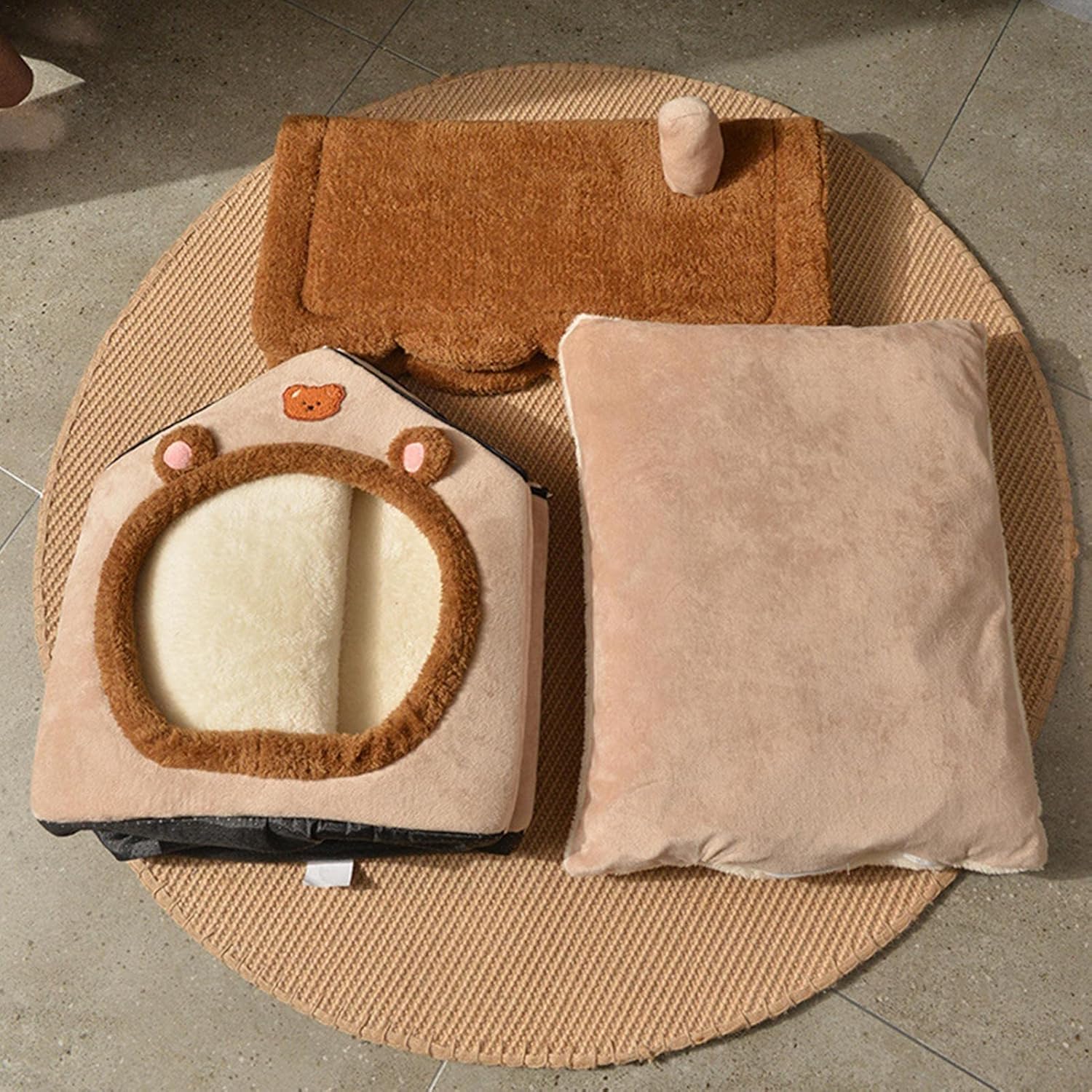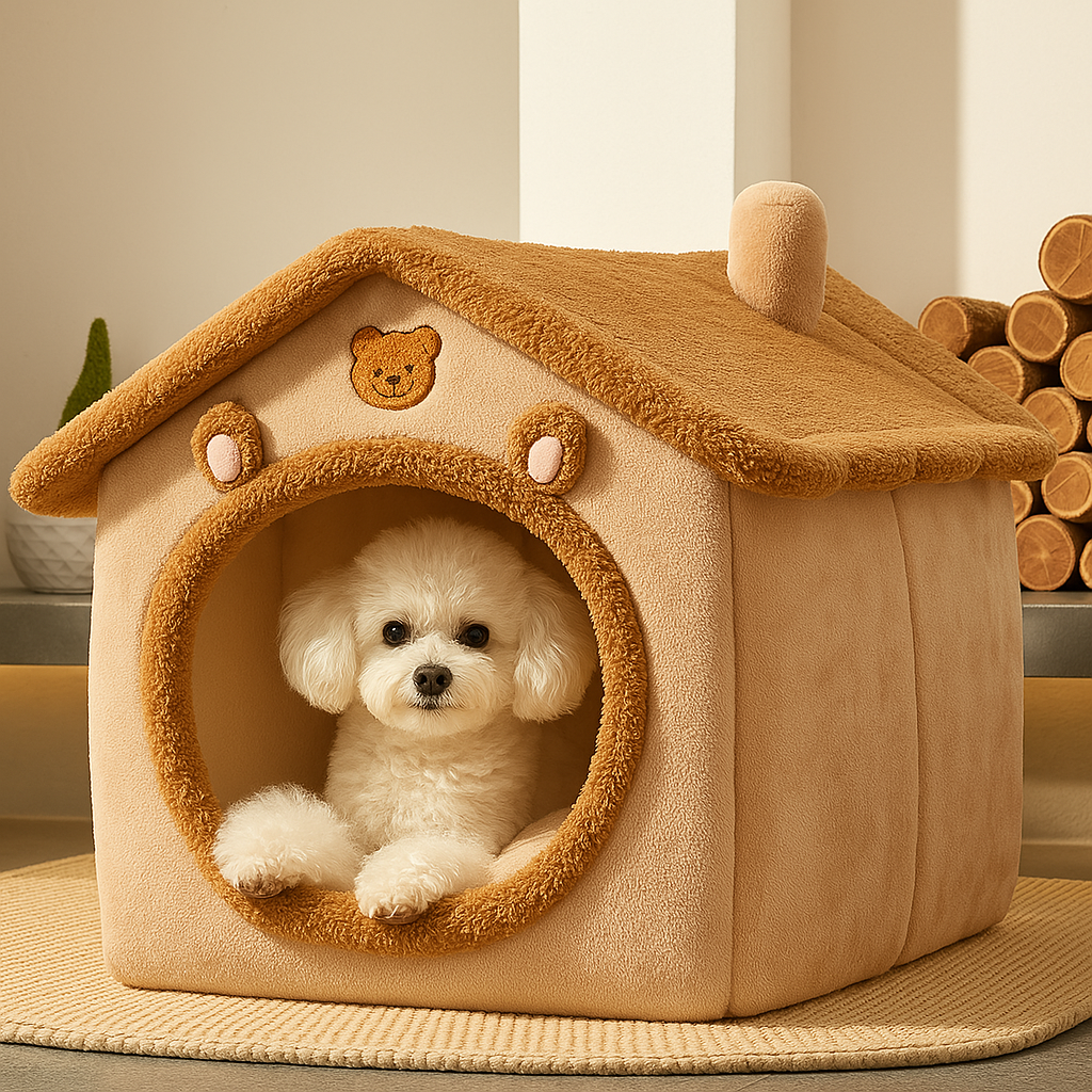 Transform your pet’s rest time into royalty with Pup Palace's Adorable Bear-Themed Dog House Bed! This cozy, plush retreat is designed with soft, golden-brown materials and an irresistibly cute bear-inspired design, complete with tiny ears and a bear face emblem. The house-shaped structure offers your furry friend a warm, secure, and private space to relax and unwind. Perfect for small to medium-sized pets, it features a comfortable cushioned base for ultimate snuggles. Both functional and charming, this dog house bed blends seamlessly into any room, making it a must-have for pets who deserve the royal treatment!